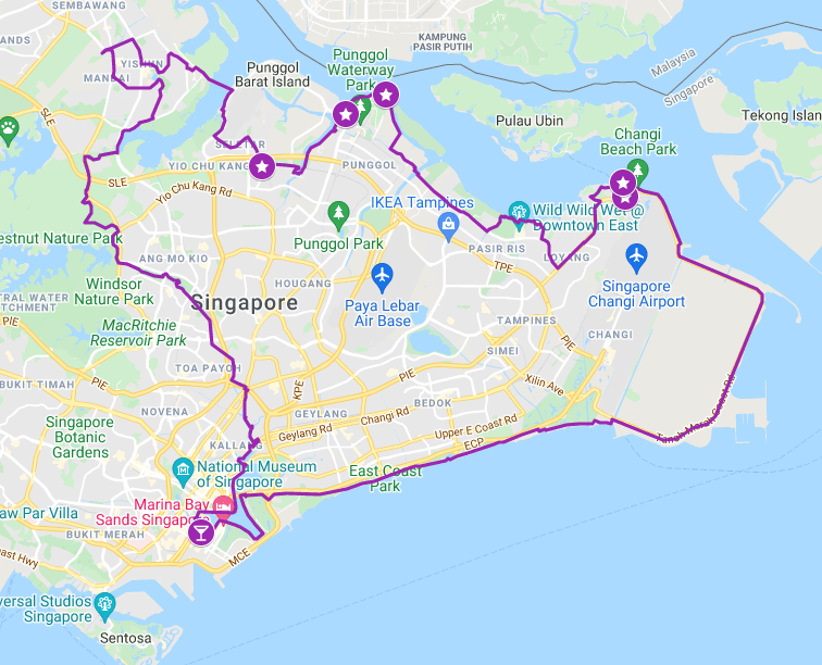 Route Comments: Have fun while checking your 100km bike ride off your bucket list! This ride begins in Marina Bay, proceeds up the Kallang River and into Yishun for some interesting surprises. Over to Seletar and Punggol, then Pasir Ris and Changi Point. There are some wild and natural parks, lovely canals, chance encounters with monkeys and beautiful views of the Strait of Johor.